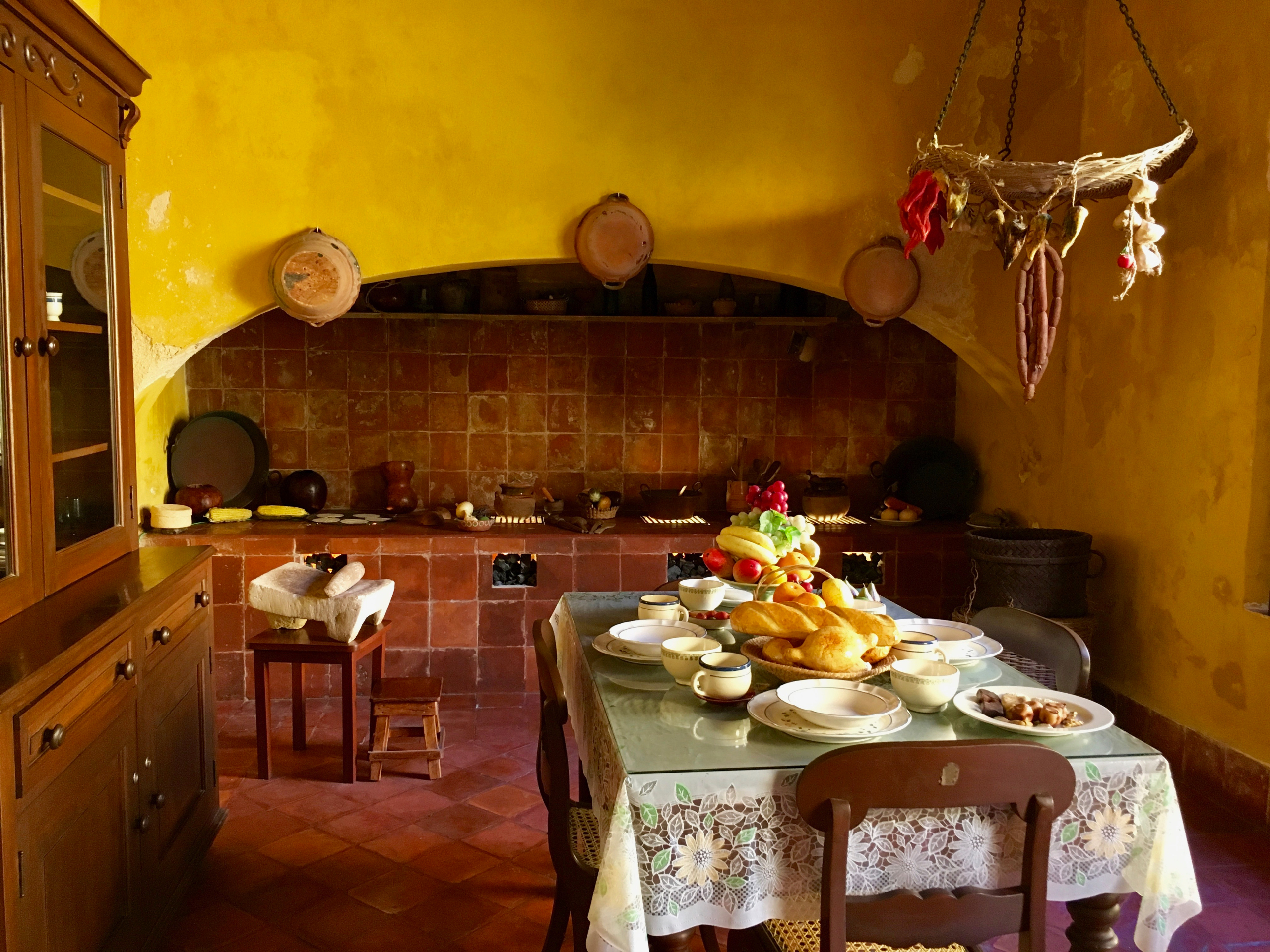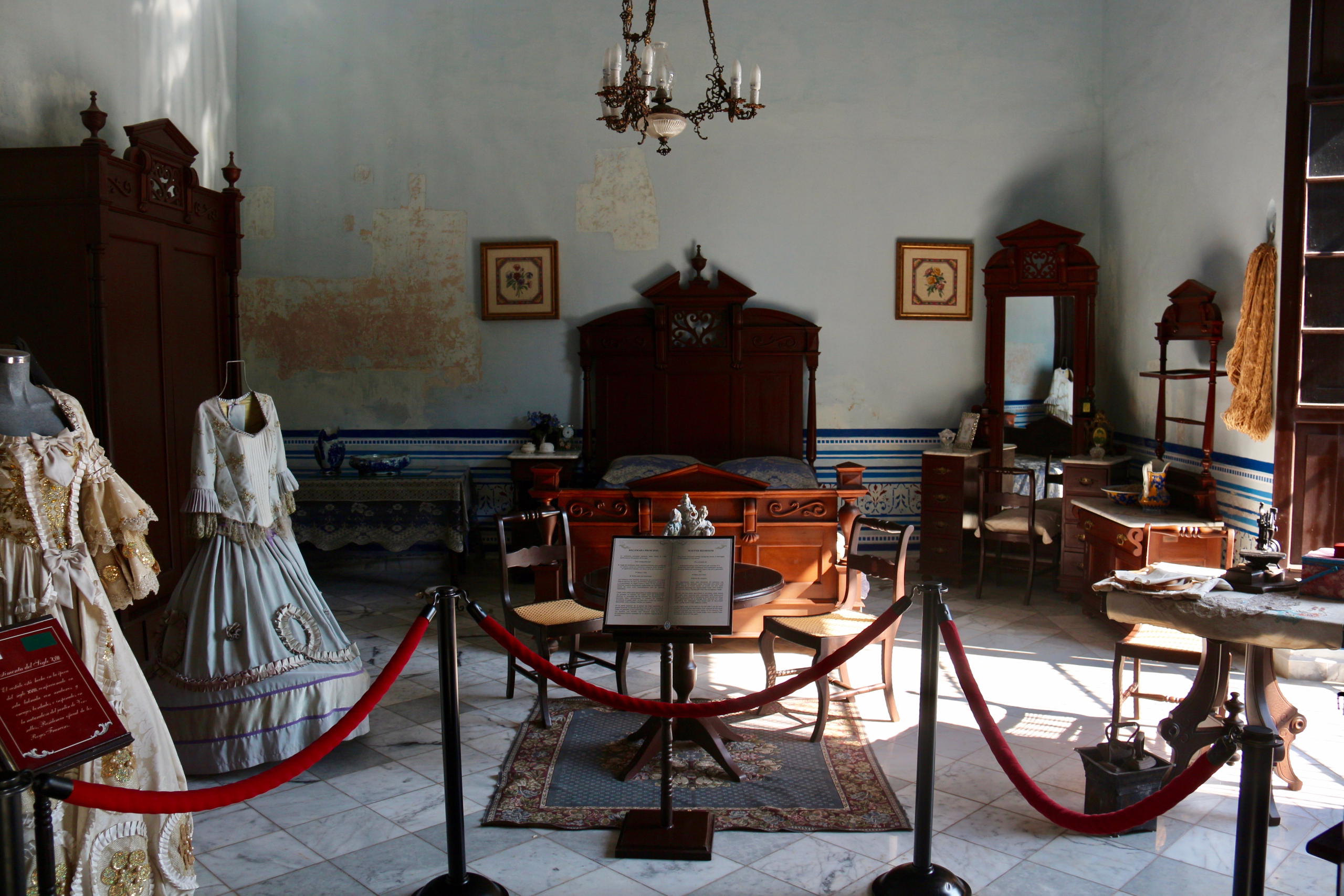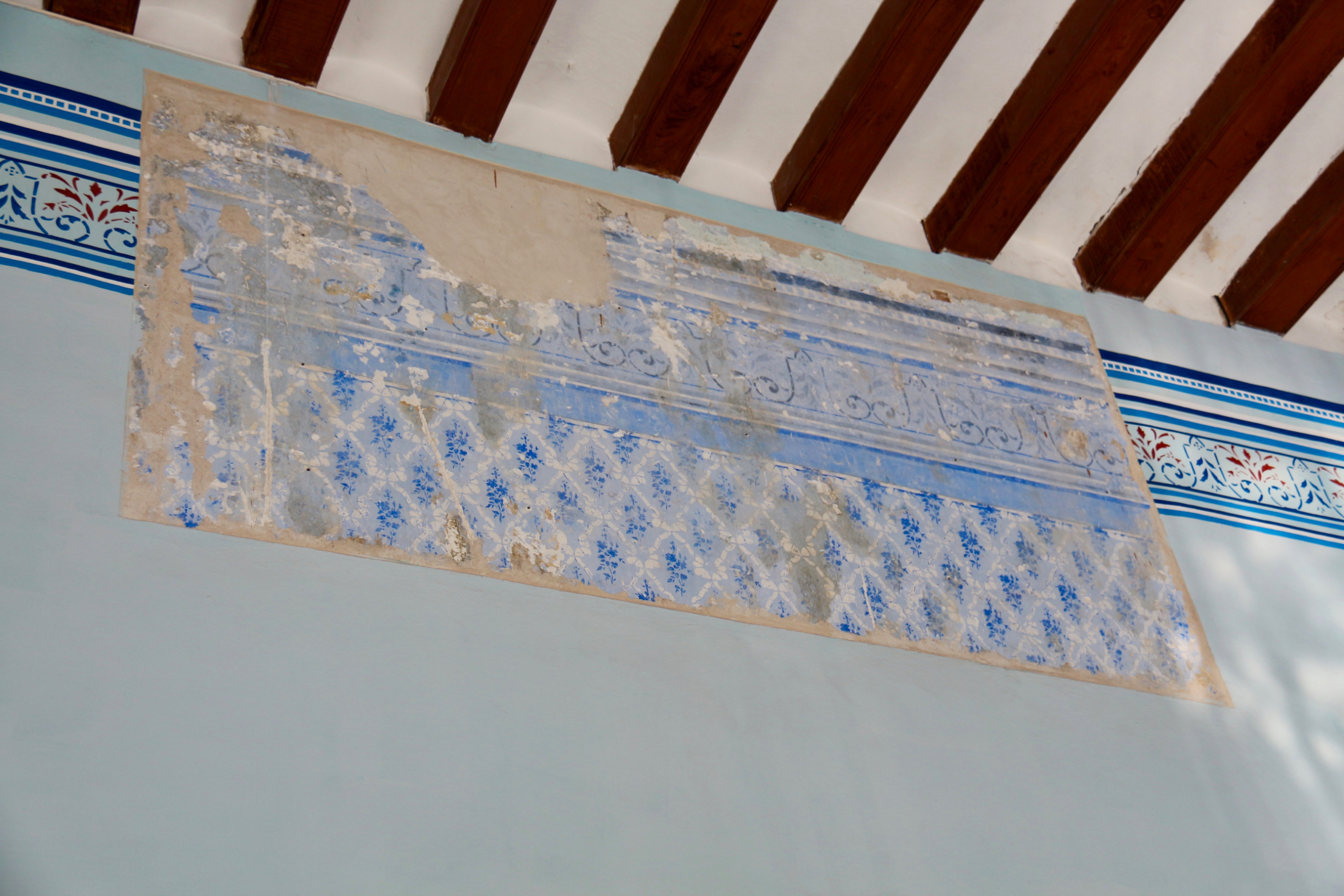 Кусок оригинальной стены. Суть суть в том, что в Мексике очень любили рисунок европейских обоев и старались не отставать от моды, НО везти бумажные обои через океан было довольно накладно и не было гарантии, что столь недолговечный товар вообще доедет в нужной кондиции. Поэтому привозились только образцы обоев, а стены красили под рисунок обоев.